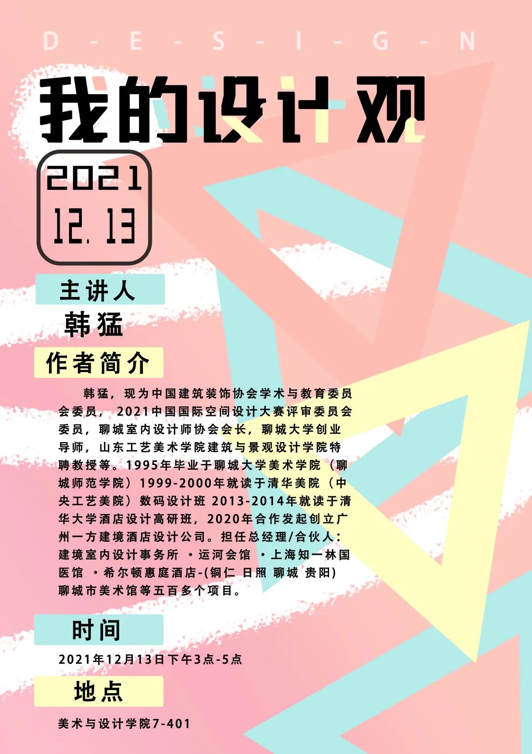 2021年12月13日,在公海gh555000aa线路检测7号楼401合堂举办《我的设计观》讲座。邀请中国建筑装饰协会学术与教育委员会委员,2021中国国际空间设计大赛评审委员会委员,聊城室内设计师协会会长,公海gh555000aa线路检测创业导师,山东工艺美术公司建筑与景观设计公司特聘教授韩猛老师主讲,公司部分研究生到场聆听。