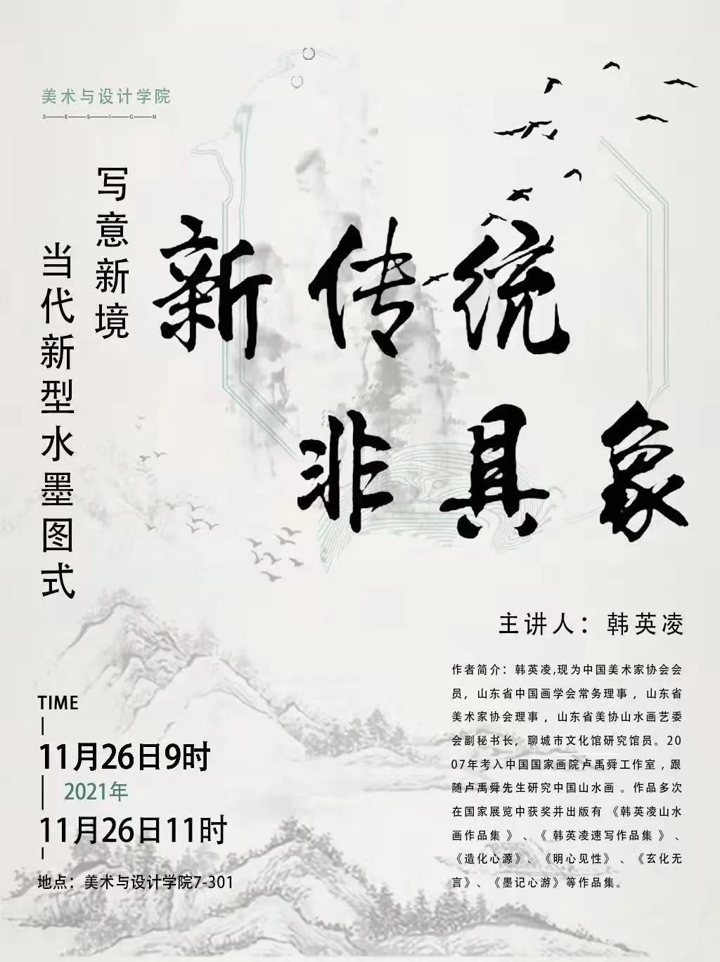 2021年11月26日,在公海gh555000aa线路检测7-301合堂举办《新传统·非具象——写意新境当代新型水墨图式》讲座。邀请中国美术家协会会员、山东省中国画学会常务理事、山东省美术家协会理事、公海gh555000aa线路检测“产业教授”韩英凌主讲,王好军老师主持,公司部分教师和研究生到场聆听。
