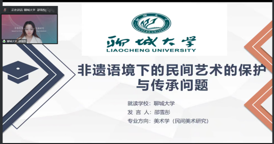 邵雪彤汇报的论文题目为《非遗语境下的民间艺术的保护与传承问题》,研究从保护主体与传承主体、民俗语境、技艺与记忆三个方面进行梳理与总结,对当下非物质文化遗产的发展现状表现出深刻的人文关怀。