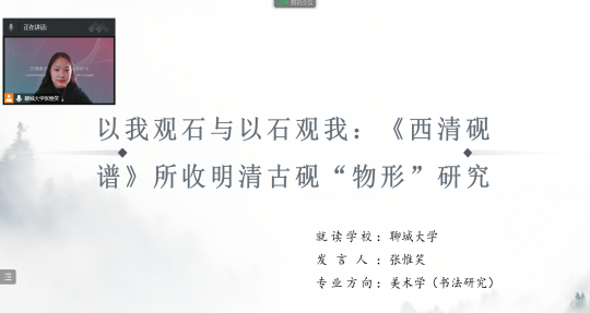 张惟笑汇报的论文题目为《以我观石与以石观我:<西清砚谱>所收明清古砚“物形”研究》,研究从以我观石、以石观我两个方面进行分享,从个案出发,从关怀物象本体上升到对人文造物思想的理论研究,是比较有研究意义以及学术价值的。