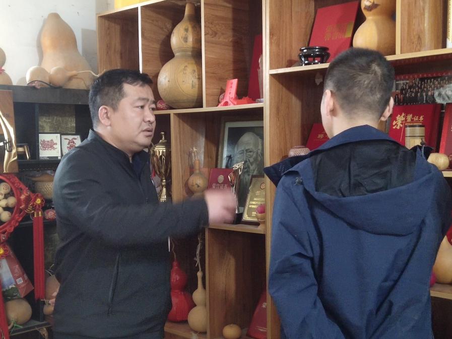 进入王树峰工作室,首先映入我们眼帘的是各式各样的葫芦,一瞬间仿佛置身于葫芦的海洋。接着王树峰老师为我们细心讲解了有关东昌葫芦雕刻的各种知识,从最开始的葫芦种植,到葫芦晾晒,再到后来的葫芦雕刻,每一步都需要付出百分之百的耐心与精力。堂屋中摆放着多件葫芦雕刻作品,我们在观赏作品的同时,都为王老师高超的葫芦雕刻技艺所惊叹。