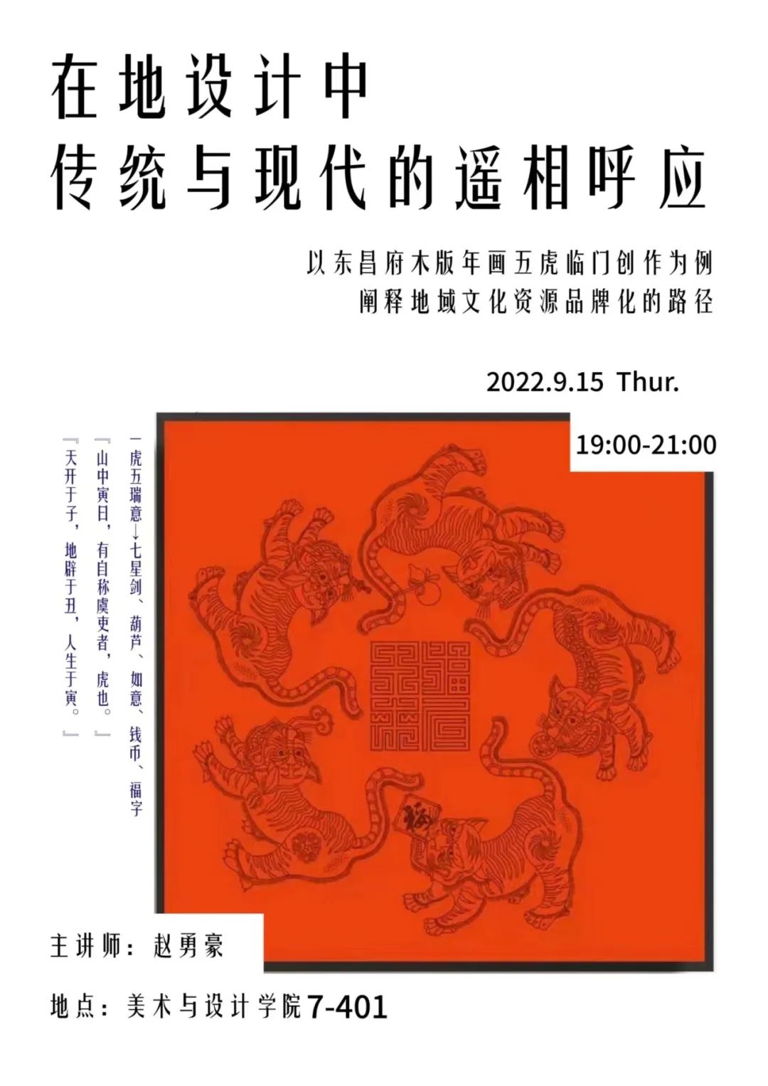 在地设计源自对地方人文历史资源的认知和洞察。结合五福(虎)临门的创作实践,赵老师对东昌府木版年画所在的聊城地域人文历史资源进行了系统梳理,聚焦有价值的概念来源,进而抽绎出创意设计的概念进行表现转换。通过讲解,我们体会到,现代与传统并不违和,现代生活的百般意义就隐藏在古老的传统符码中,且亮丽璀璨。