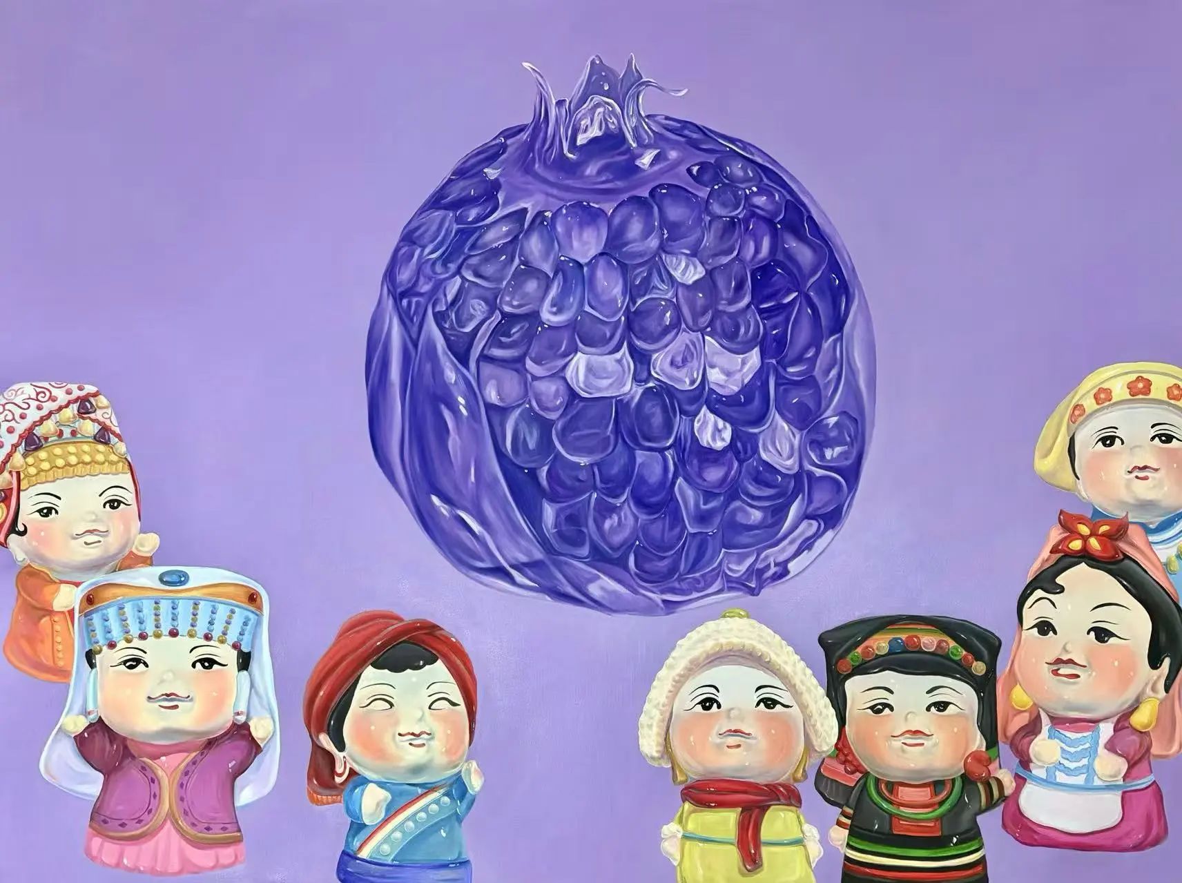 《说文》中提到:“团,圆也。”无论是“团”字还是“圆”字,都有着团聚、团结、圆满、完整之意。石榴又有着团圆有爱,富贵兴旺之意。伟大的中华民族由五十六个民族组成,在这幅画面中绘画了其中的七个,从左到右分别是身着柯尔克孜族、塔吉克族、土家族、鄂温克族、德昂族、塔塔尔族、水族服饰的中国传统瓷娃娃。她们围着一个巨大石榴,石榴籽之间的紧紧相拥代表着各少数民族之间的团结一心,共同组成了一个完整的石榴。