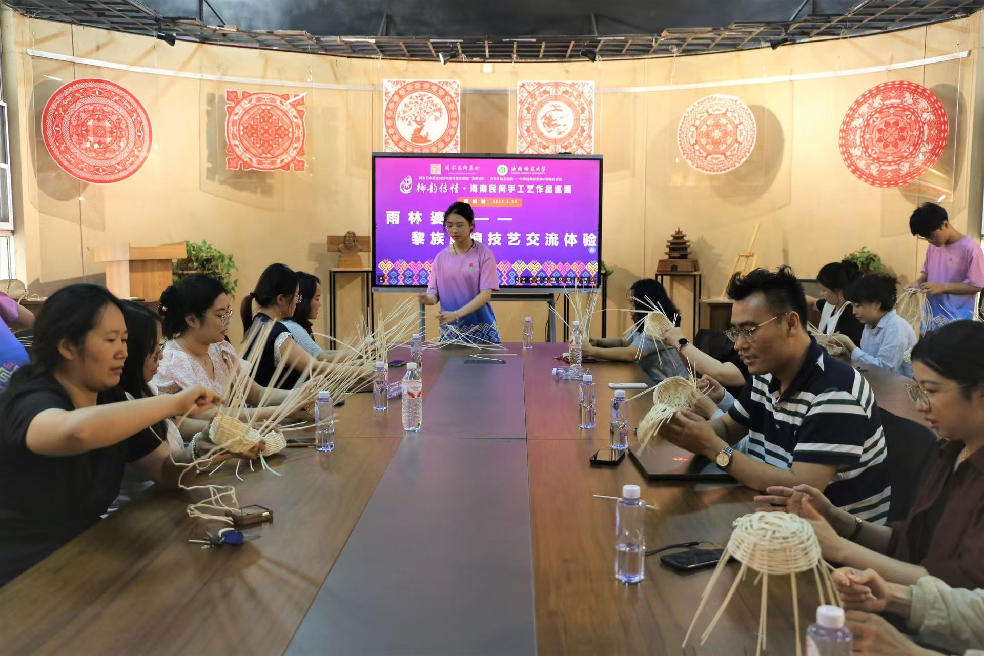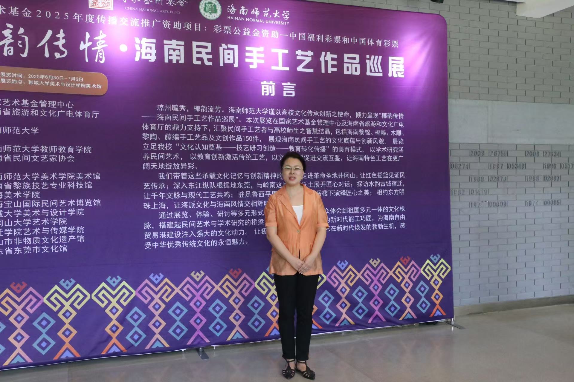 项目主持人、海南师范大学邱娜副教授详细介绍了展览项目,她提到,本次巡展涵盖丰富的作品,提取了海南特色热带岛屿文化,诸如生活器具、装饰艺术、民俗服饰等多个类别,这些展品不仅是技艺的结晶,更承载着海南人民对自然的敬畏与对生活的热爱。
